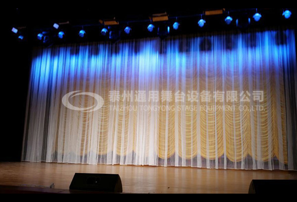 一般不作為場館的固定裝置,是以薄質地帶有網狀孔眼的棉布或化纖材料制成的半透明幕布。除本身所具有的輕薄,打摺后可以制作成各種裝飾幕特點以外,還具有一定的透光作用。舞臺上常用白紗幕、黑紗幕、紗畫幕表現場景環境,從紗畫幕后面向景物投光可以顯現隱藏在后面的人物和空間環境,從而且易于表現夢幻、回憶的虛擬場面;從前面向紗幕投光可以表現渲染紗畫幕上所畫的形象;從紗幕背面向紗幕投光時,紗畫幕前面所畫的形象看起來則不復存在。